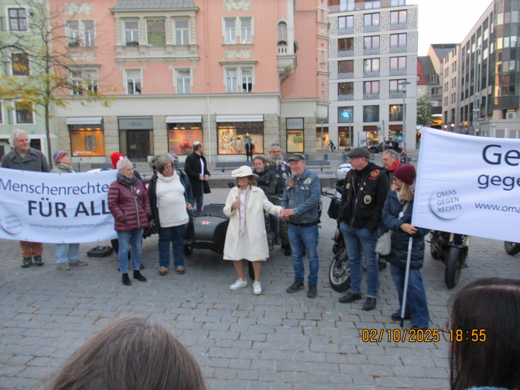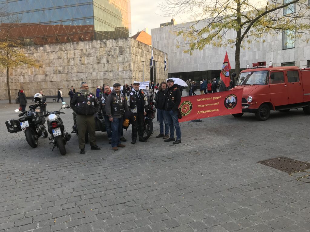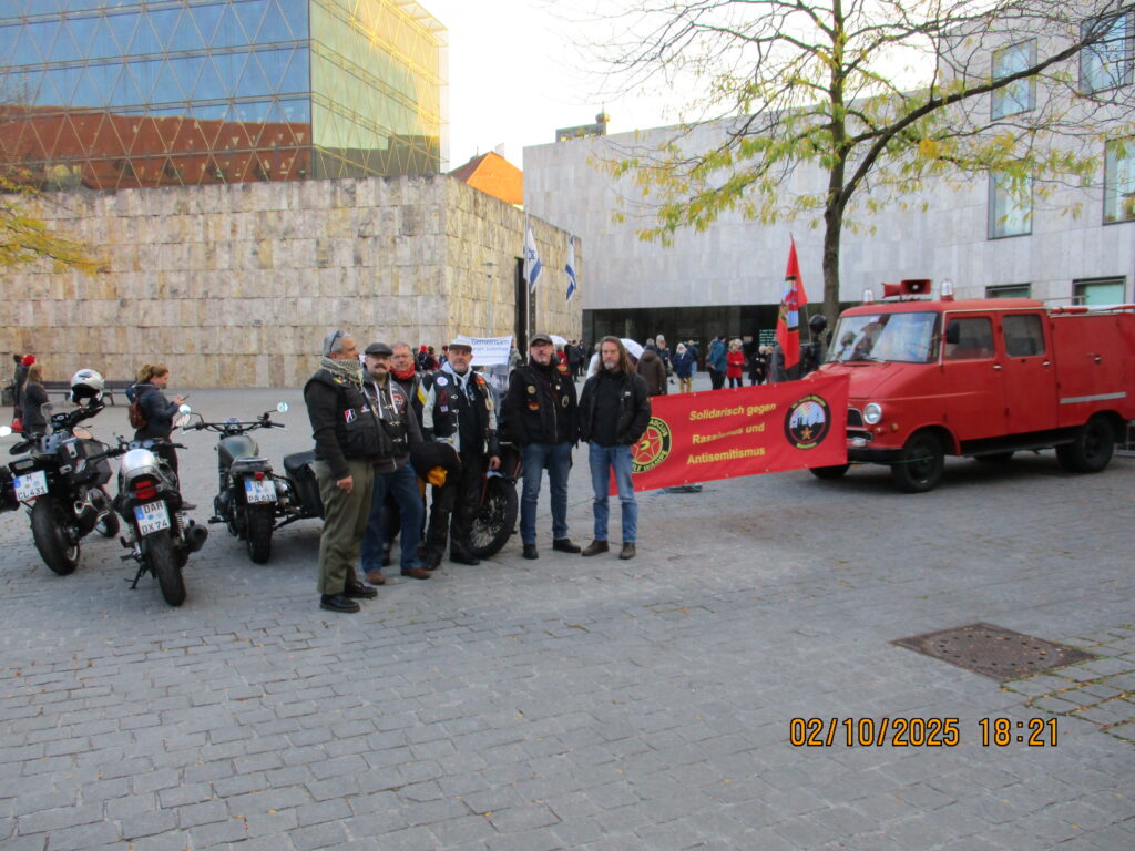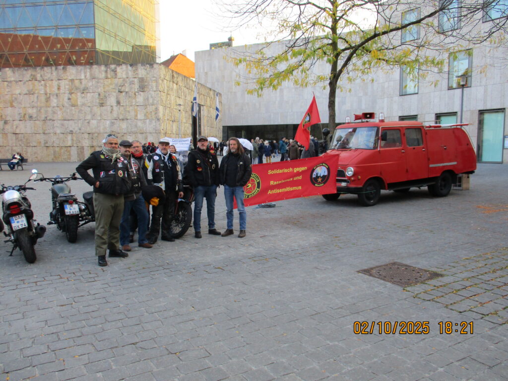 02.10.2025 Mahnwache des MC Kuhle Wampe München gegen Rassismus und Antisemitismus unter dem Motto „Wir schützen unsere Synagoge“ vor der Münchner Synagoge, in diesem Jahr erstmals mit Unterstützung des Roten Blitz. Antisemitismus und Judenhass haben keinen Platz in unserer Stadt!